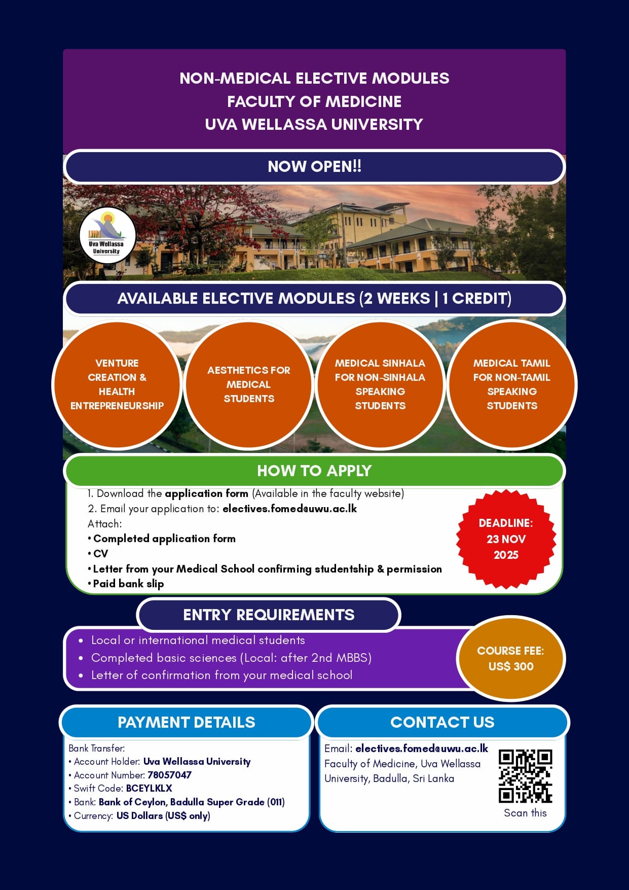 The Dean's Office of Uva Wellassa University's Medical Faculty will be inaugurated during a ceremonial opening on May 12th, 2023, at 10:00